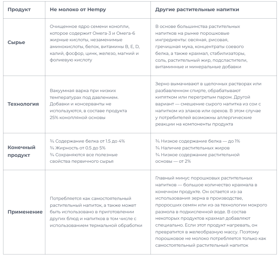 Как понять, в чем их различие и чем конопляное не молоко выгодно отличается от остальных видов растительных напитков? Сравните сами.